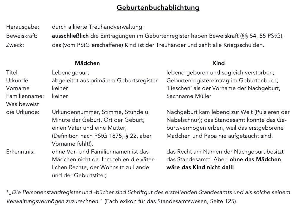 Das Herzstück unserer Überlegungen somit war, wie man die Rechtstellung eines einzelnen Indigenat-Deutschen öffentlich restituiert, damit dieses renitente Volk zum Zweck des Friedensschlusses mit der Welt wie ein Phönix aus der Asche wieder auferstehen kann. Insofern wollen wir Sie trotzdem, -obwohl Ihnen die Situation sicherlich mehr als klar ist-, auf ein „Versäumnis“ unserer örtlichen Behörden hinweisen, auf ein Detail nur, das jedoch biblische Auswirkungen birgt: Im deutschen Landrecht registrierte man einst Geburtsfälle von „Mädchen“ oder „Knaben“, die durch die väterliche Abstammung über alle indigenen Rechte verfügten. Weil der fremden Regierung seit dem 28. Oktober 1918 die Indossamente und Verfügungsrechte fehlten, wurden die Personenstandsregister mit der Fiktion von Recht geflutet (überlagert) und Personenstandsfälle tauchten auf. Da hierzulande ausschließlich das Personenstandsregister Beweiskraft hat, haben wir uns gefragt, was genau sie dort eigentlich aufgeschrieben haben. Sie haben kurz und prägnant zwei Ereignisse aufgeschrieben: