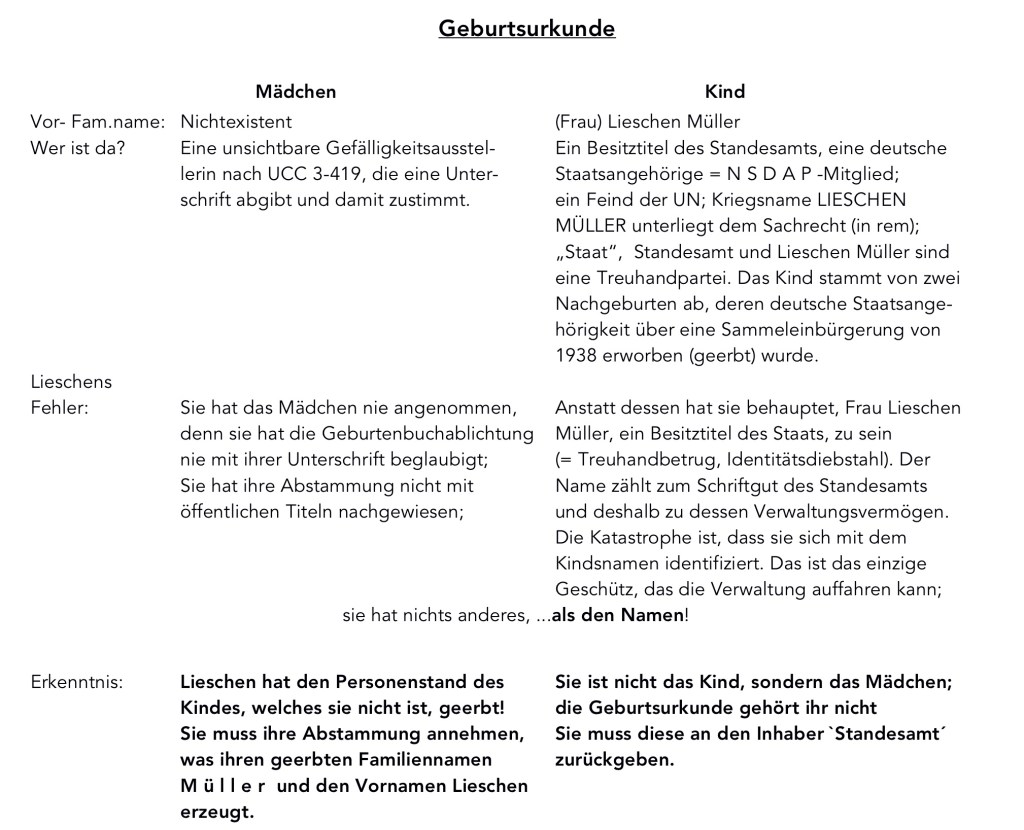 Formulartechnisch „verstarb“ dieses „Kind“ rasch und dank des unregistrierten Vaters transferierte das Standesamt das Geburtsvermögen des Geburtsfalls an Vater Staat, den nunmehr Begünstigten. Das Standesamt erschuf völlig neu einen Vor- und Zunamen und ließ mit Ausfertigung der Geburtsurkunde seither den Geburtsfall des namenlosen Mädchens / Knaben völlig unberücksichtigt. Das bedeutet, dass jeder sogenannte Deutsche unter dem falschen Namen eines Anderen, nämlich dem seines nach der Geburt verstorbenen „Zwillings“, auftritt und mangels gesetzlicher Registrierung keine eigenen Titel und Papiere vorweisen kann. Es sind somit die falsche Identität und die falschen Personenstandstitel, die hierzulande das Leben zur Hölle machen und unsereinen völlig rechtlos stellen. Niemand tritt ungestraft als jemand anderer auf, aber genau das tun so wie alle `Deutschen’. Insofern verfügen die Deutschen über keinerlei Personenstandsurkunden für sich selbst!